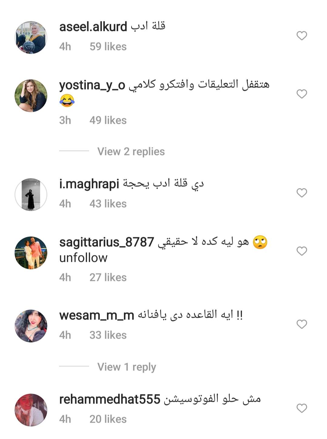 ومن ثم انهالت تعليقات حادة من متابعيها بسبب تضمت الفوتوسيشن على صور غير لائقة، فعلق لها أحدهم قائلًا:" هي خلاص وصلت أن البنت تتصور بالشكل اللي ملوش أي علاقة بالدين ولا التربية ولا الأخلاق دا"، وكتب الآخر: "دي قلة أدب والله".