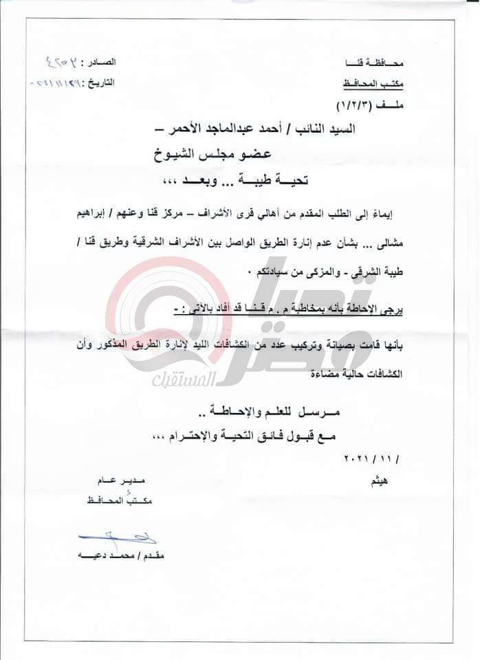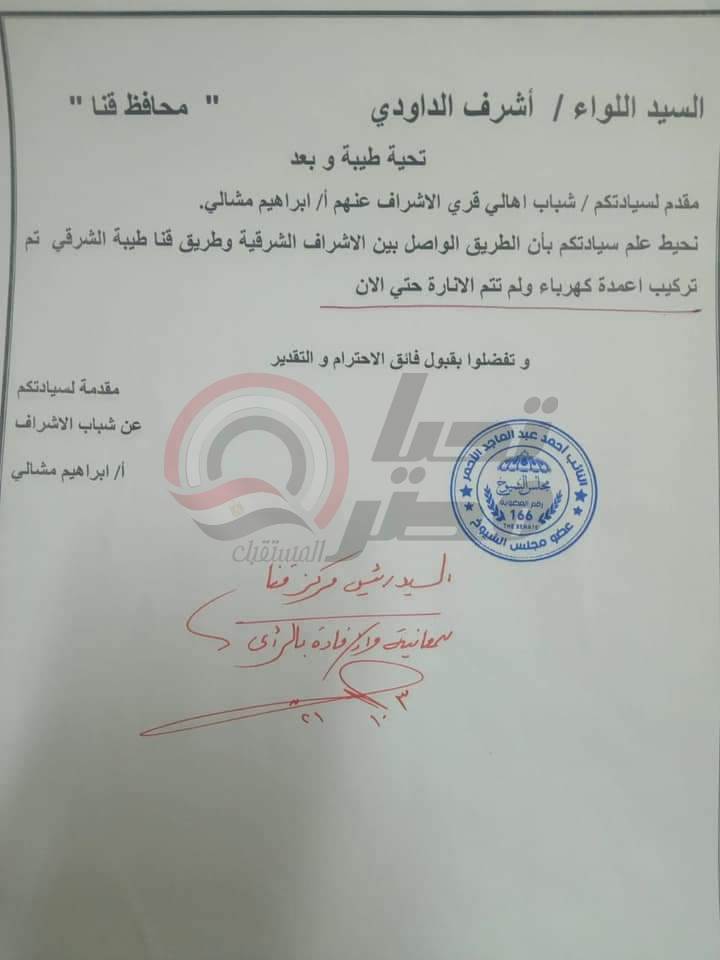 يذكر أن قد تقدم البرلمانى أحمد عبدالماجد الأحمر عضو مجلس الشيوخ ، تقدم بطلب الي اللواء أشرف الداودى محافظ قنا بشأن أنار الطرق بقري الأشراف وتم الإستجابة من المسؤولين صباح اليوم واتخاذ الإجراءات اللازمة .