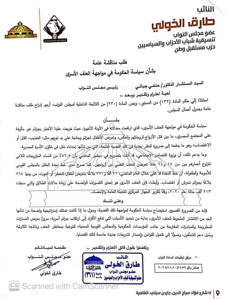 وكان النائب طارق الخولي، تقدم بطلب مناقشة عامة بشأن سياسة الحكومة في مواجهة العنف الأسرى، حيث جاء نص الطلب كالتالي :