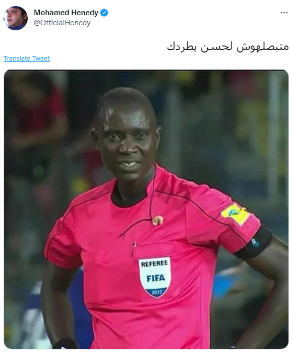 فنشر محمد هنيدي عبر موقع التدوينات القصيرة “تويتر” صورة لحكم المباراة معلقًا بطريقة ساخرة:”متبصلهوش لحسن يطردك”.