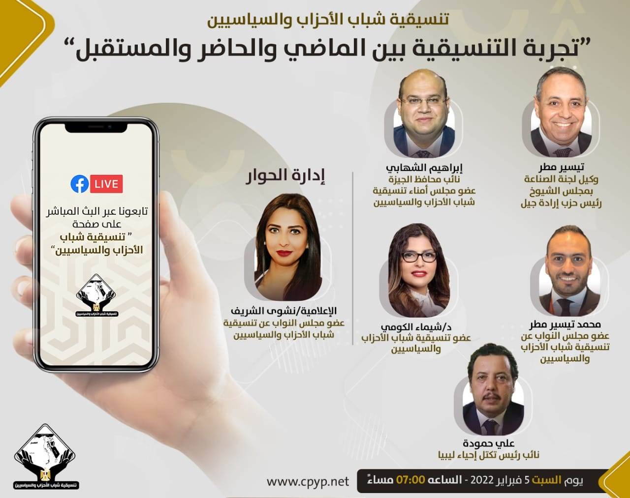 كما يستعرض الصالون الذي سيذاع على الصفحة الرسمية بتنسيقية شباب الأحزاب والسياسيين بموقع التواصل الاجتماعي فيسبوك عدد من التحديات التي واجهت النظام الحزبي والسياسي المصري خلال الفترة الماضية وكيفية التغلب عليها وشعار التنسيقية بخلق سياسة بمفهوم جديد وقدرتها على الجمع بين عدد كبير من الرؤى والأفكار والتوجهات السياسية المختلفة بالإضافة إلى كيفية الدمج بين الأجيال المختلفة في الكيان سواء الأعضاء القدامى أو المنضمين حديثا عقب انتهاء فترة تدريبهم وتأهيلهم للمشاركة الفاعلة .