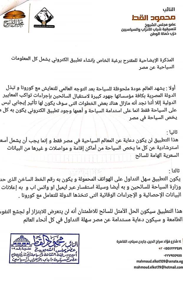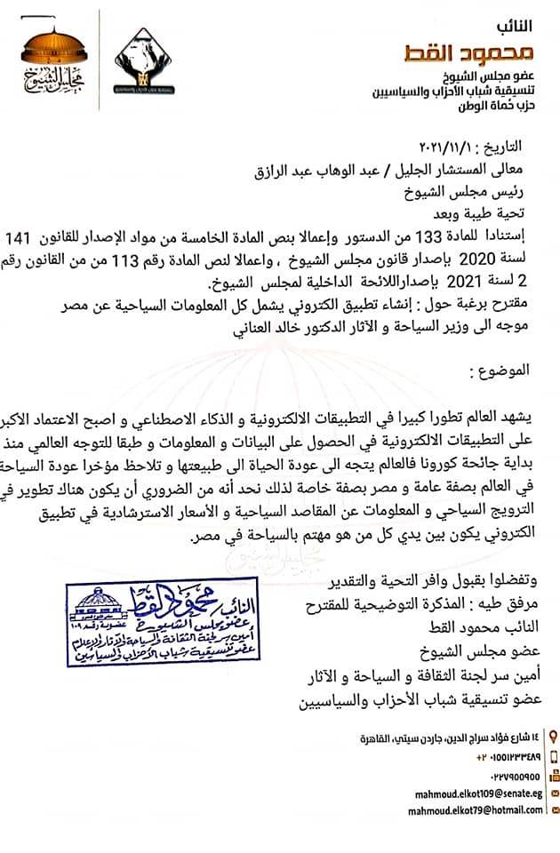 وكان تقدم النائب محمود القط، أمين سر لجنة الاعلام والثقافة والسياحة والآثار بمجلس الشيوخ، عضو تنسيقية شباب الأحزاب والسياسيين، باقتراح برغبة إلى المستشار عبد الوهاب عبد الرازق، رئيس المجلس، موجها الى وزير السياحة و الآثار الدكتور خالد العناني، بشأن إنشاء تطبيق الكتروني يكون شاملا كل ما يهم السائح من أماكن سياحية و متاحف و اسعار استرشادية و خط ساخن للتواصل مع وزارة السياحة.