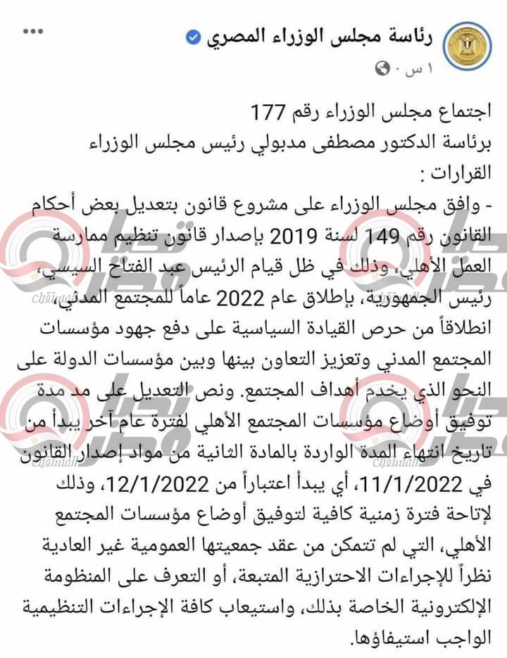وكان مجلس الوزراء، استجاب للمقترح برغبة الذي تقدم به النائب محمود تركي، عضو مجلس الشيوخ عن تنسيقية شباب الأحزاب والسياسيين، ووافق المجلس على مشروع قانون بتعديل بعض أحكام القانون رقم 149 لسنة 2019 بإصدار قانون تنظيم ممارسة العمل الأهلي.