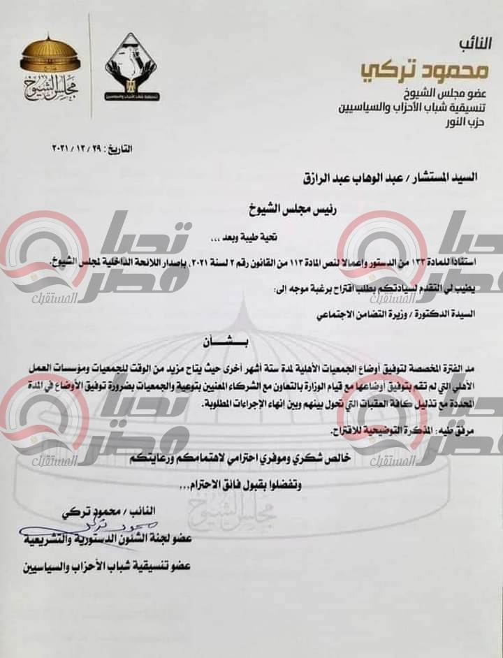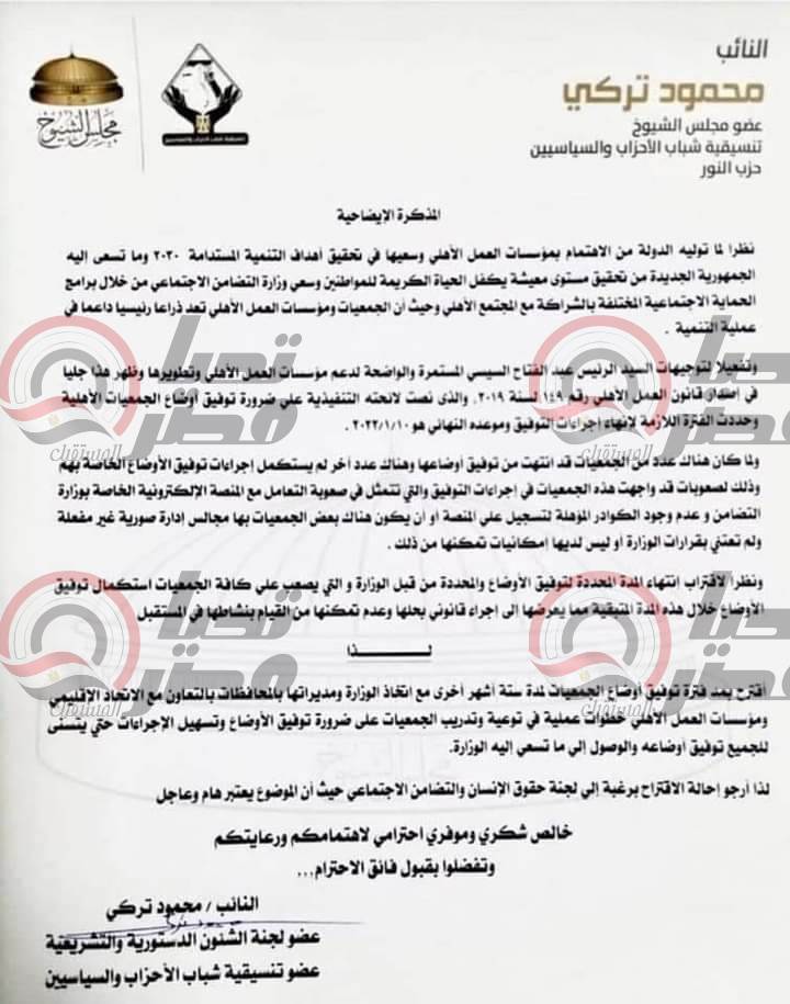 طلب النائب محمود تركي بشأن مد الفترة المخصصة لتوفيق أوضاع الجمعيات الأهلية