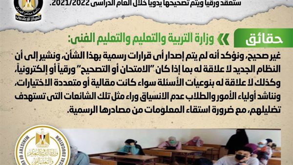 وقال المركز الاعلامي أن بعض المواقع الإلكترونية وصفحات التواصل الاجتماعي أنباء بشأن صدور قرار بعودة النظام القديم لامتحانات الثانوية العامة والتي ستعقد ورقياً ويتم تصحيحها يدوياً خلال العام الدراسي 2021/2022، وقد قام المركز الإعلامي لمجلس الوزراء بالتواصل مع وزارة التربية والتعليم والتعليم الفني، والتي نفت تلك الأنباء، مُؤكدةً أنه لا صحة لعودة النظام القديم لامتحانات الثانوية العامة، وأنه لم يتم إصدار أي قرارات رسمية بهذا الشأن، مُوضحةً أن النظام الجديد لا علاقة له بما إذا كان "الامتحان أو التصحيح" ورقياً أو إلكترونياً، وكذلك لا علاقة له بنوعيات الأسئلة سواء كانت مقالية أو متعددة الاختيارات، مُناشدةً أولياء الأمور والطلاب عدم الانسياق وراء مثل تلك الشائعات التي تستهدف تضليلهم، مع ضرورة استقاء المعلومات من مصادرها الرسمية.