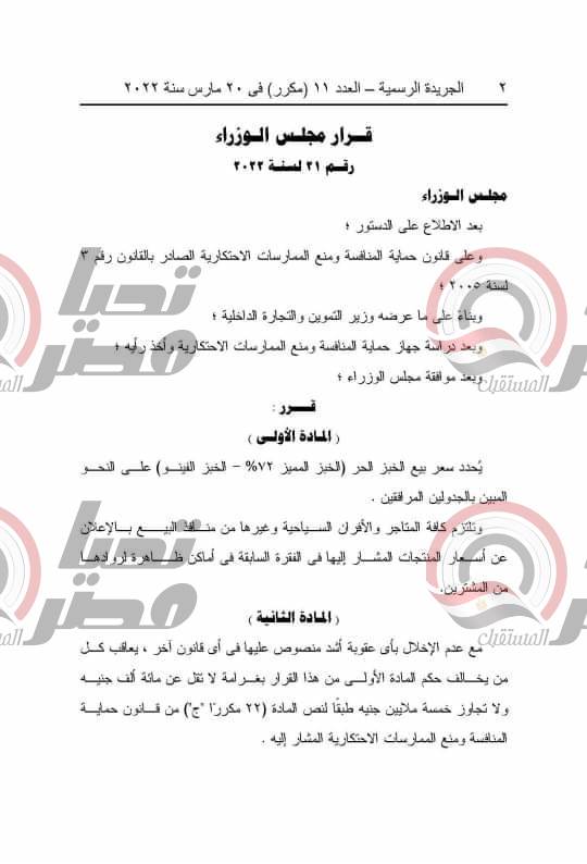 تضمن القرار معاقبة من يبيع الخبز بأكثر من سعره بغرامة لا تقل عن 100 ألف جنيه ولا تزيد على 5 ملايين جنيهتستند هذه العقوبة إلى المادة 22 مكرر (ج) من قانون حماية المنافسة ومنع الممارسات الاحتكارية رقم 3 لسنة 2005 وتعديلاته.