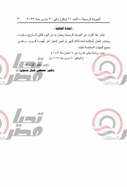القرار الصادر من مجلس الوزراء، الزم جميع المخابز والأفران ومنافذ البيع بالالتزام بهذه الأسعار لمدة ثلاثة أشهر أو لحين إشعار آخر، أيهما أقرب.