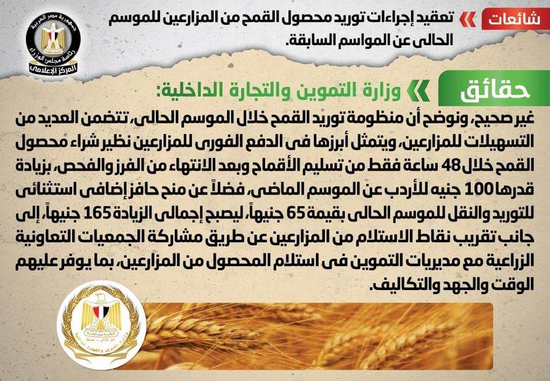 نفى المركز الإعلامي لرئاسة مجلس الوزراء، مزاعم تعقيد إجراءات توريد محصول القمح من المزارعين للموسم الحالي عن المواسم السابقة، حيث أعلن المركز التواصل مع وزارة التموين والتجارة الداخلية، والتي نفت تلك الأنباء، مُوضحةً أن منظومة توريد القمح خلال الموسم الحالي، تتضمن العديد من التسهيلات للمزارعين، ويتمثل أبرزها في الدفع الفوري للمزارعين نظير شراء محصول القمح خلال 48 ساعة فقط من تسليم الأقماح وبعد الانتهاء من الفرز والفحص، بزيادة قدرها 100 جنيه للأردب عن الموسم الماضي.