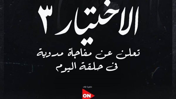 وتابعت كاشفة عن مواعيد عرض الحلقة: الاختيار 3 عرض الساعة ٩:٣٠ مساءً، و يعاد ٤:٢٠ صباحاً و ٣:٢٥ مساءً حصرياً على شاشات on”.