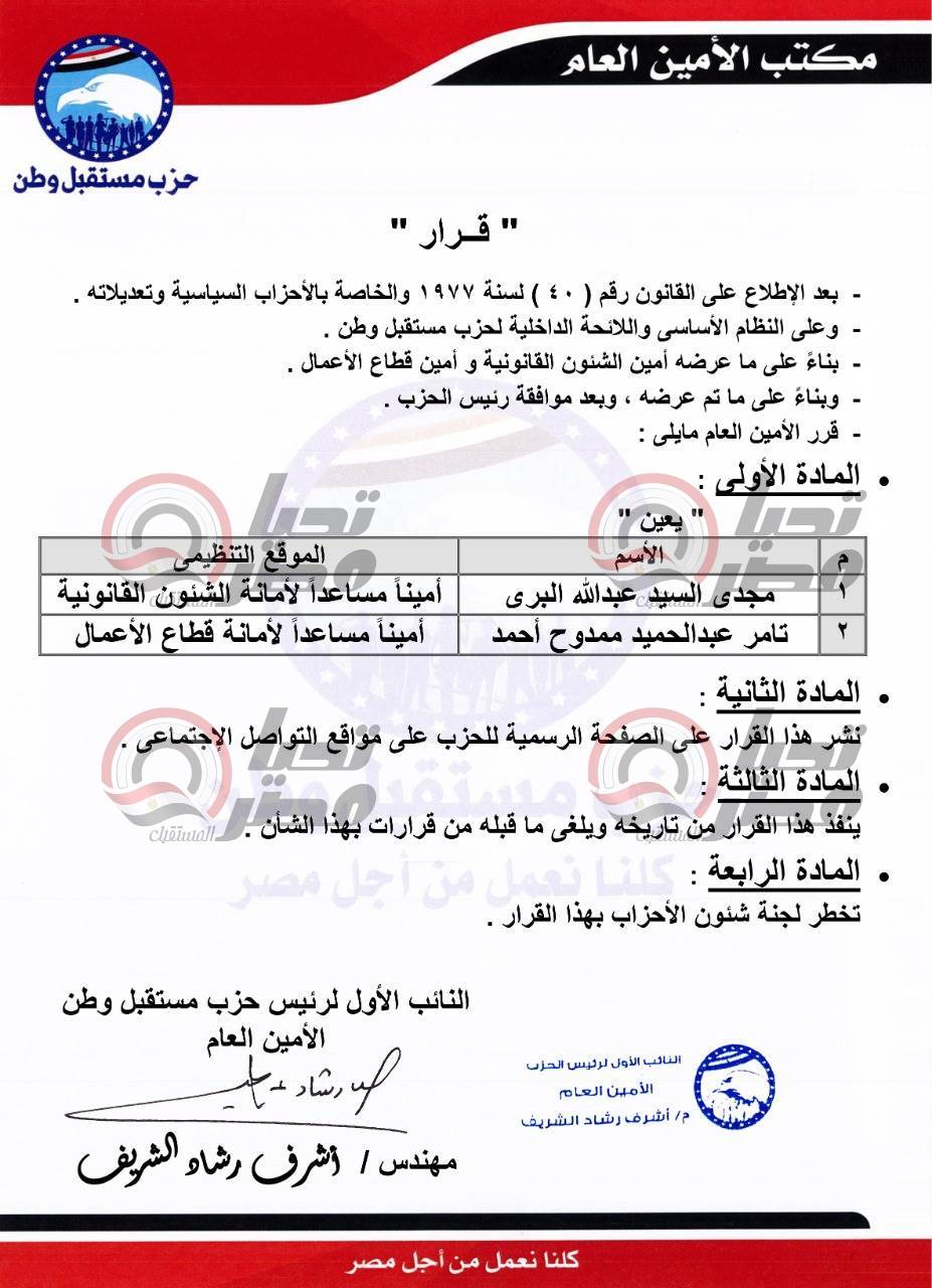 قرر النائب أشرف رشاد ممثل الأغلبية بمجلس النواب والنائب الأول لحزب مستقبل وطن، الأمين العام تعيين المستشار مجدى السيد عبدالله البرى، أمينًا مساعدًا لأمانة الشئون القانونية . جاء ذلك القرار بعد الاطلاع على القانون رقم 40 لسنة 1977 والخاصة بالاحزاب السياسية وتعديلاته، والاطلاع على النظام السياسي واللائحة الداخلية لحزب مستقبل وطن، مع نشر هذا القرار على الصفحة الرسمية للحزب على مواقع التواصل الاجتماعي، وتنفيذه من تاريخه ويلغى ما قبله من قرارات بهذا الشأن.
