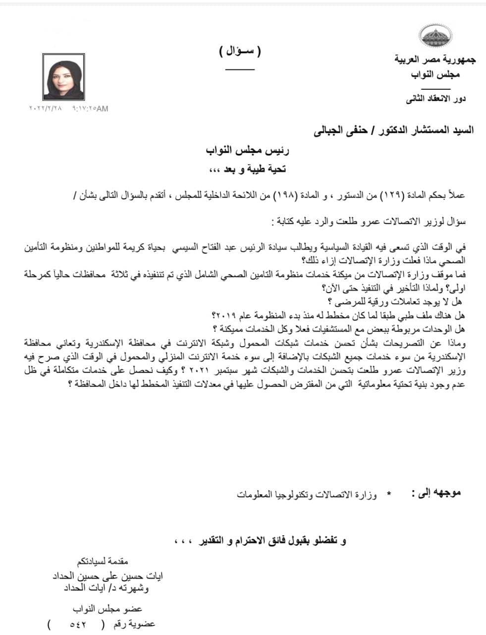 أيات الحداد تتقدم بسؤال لوزير الاتصالات بشان موقف الوزارة ميكنة خدمات منظومة التامين الصحي الشامل
