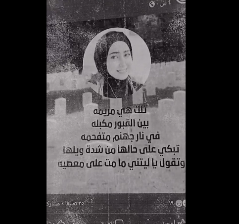 وواصلت الوالدة: رغم وفاة مريم وما مرينا به من حالة قهر، إلا أن هذا الشاب لم يتوقف عن نشر صور مريم التي يقوم فيها بالدعاء عليها، وازداد الأمر سوءًا بنشره صورًا لي شخصيًا ولإبنتي دعاء، ويتهمنا فيها بممارسة أعمال منافية للآداب.