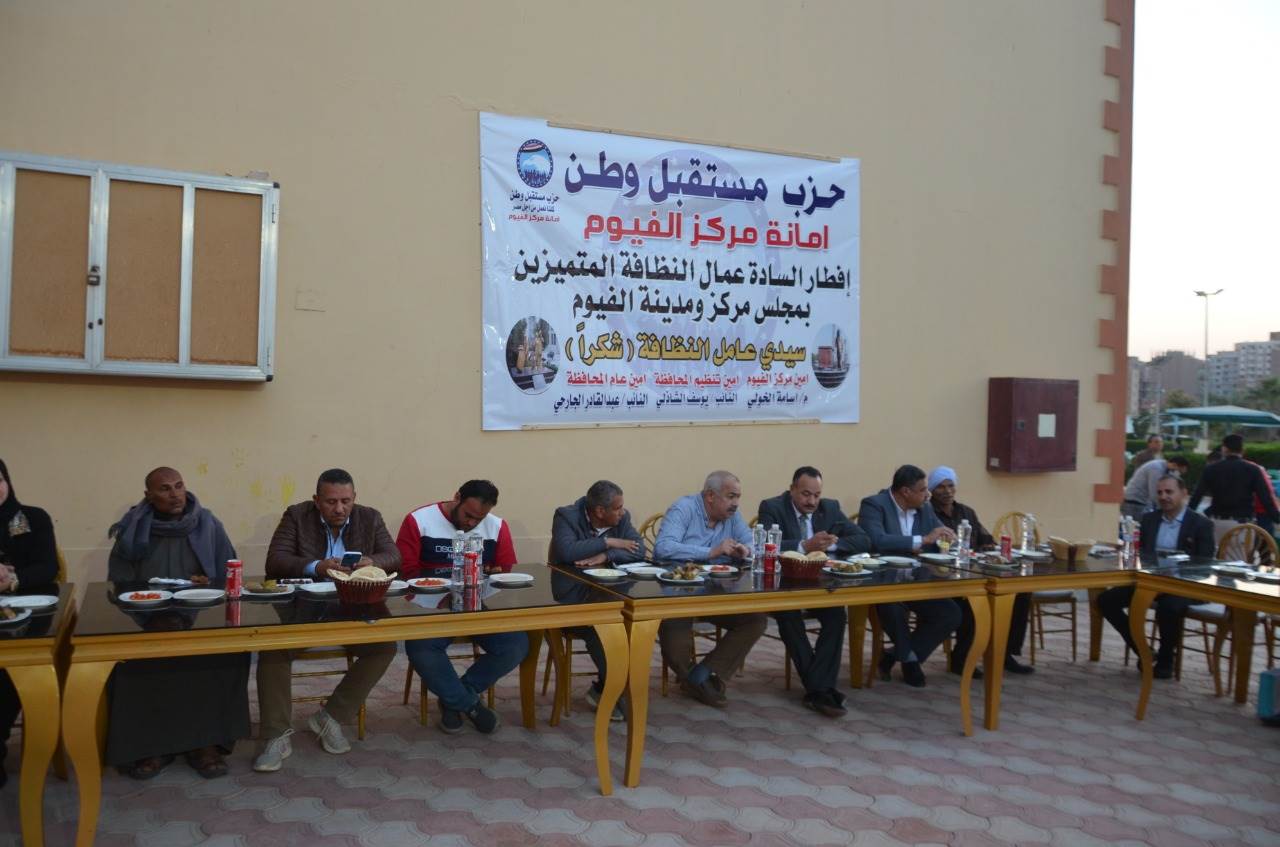 وفي محافظة الفيوم، نظمت أمانة مركز الفيوم، حفل إفطار جماعي، لعمال النظافة بمجلس مدينة الفيوم، بحضور أعضاء وقيادات ونواب الحزب، وذلك لتهنئتهم بشهر رمضان المبارك، وتناولهم وجبة الإفطار معهم، وتقديراً بدورهم العظيم وتحفيزهم في الحفاظ على المظهر الجمالي والحضاري للمحافظة.