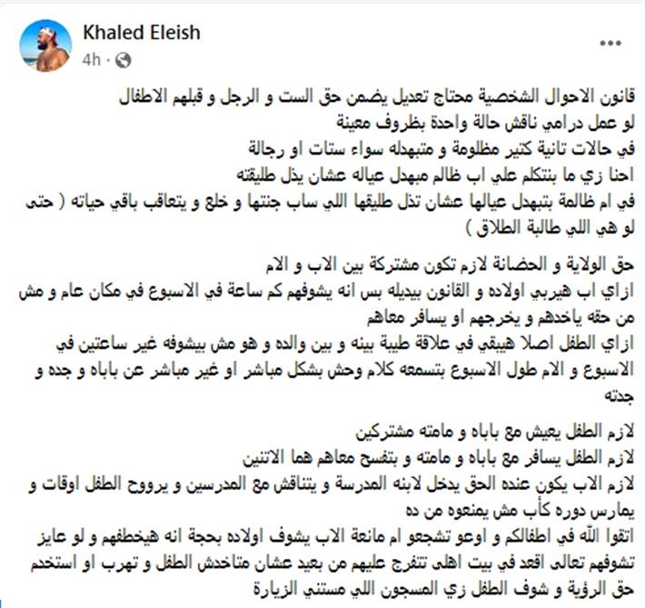كتب الفنان خالد عليش عبر صفحته الشخصية بموقع التواصل الاجتماعي “فيسبوك”: “قانون الأحوال الشخصية محتاج تعديل يضمن حق الست والرجل وقبلهم الأطفال.. لو عمل درامي ناقش حالة واحدة بظروف معينة، في حالات تانية كتير مظلومة ومتبهدله سواء ستات أو رجالة”.