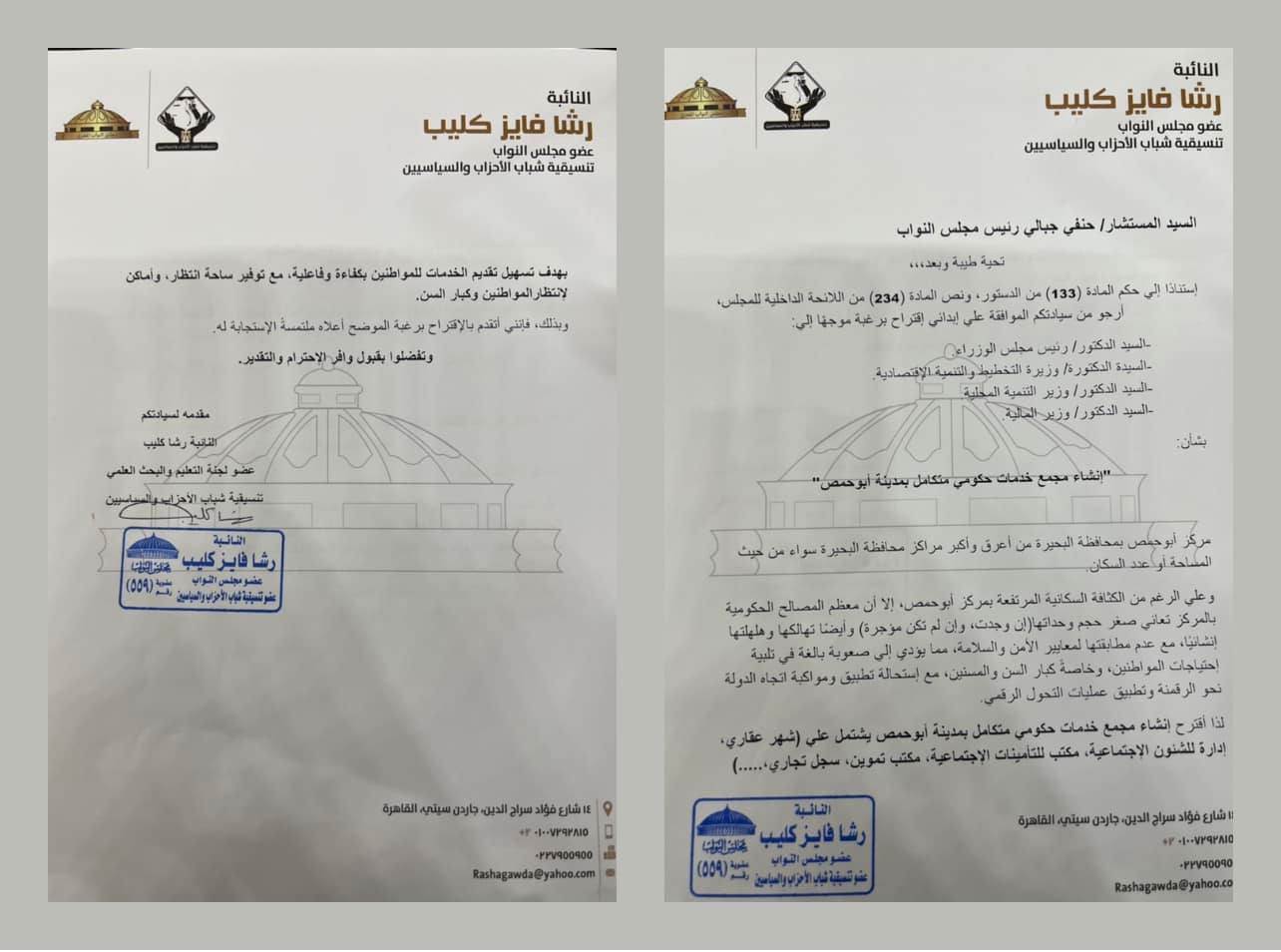 رشا فايز تتقدم باقتراح لإنشاء مجمع خدمات حكومي متكامل بمدينة أبوحمص