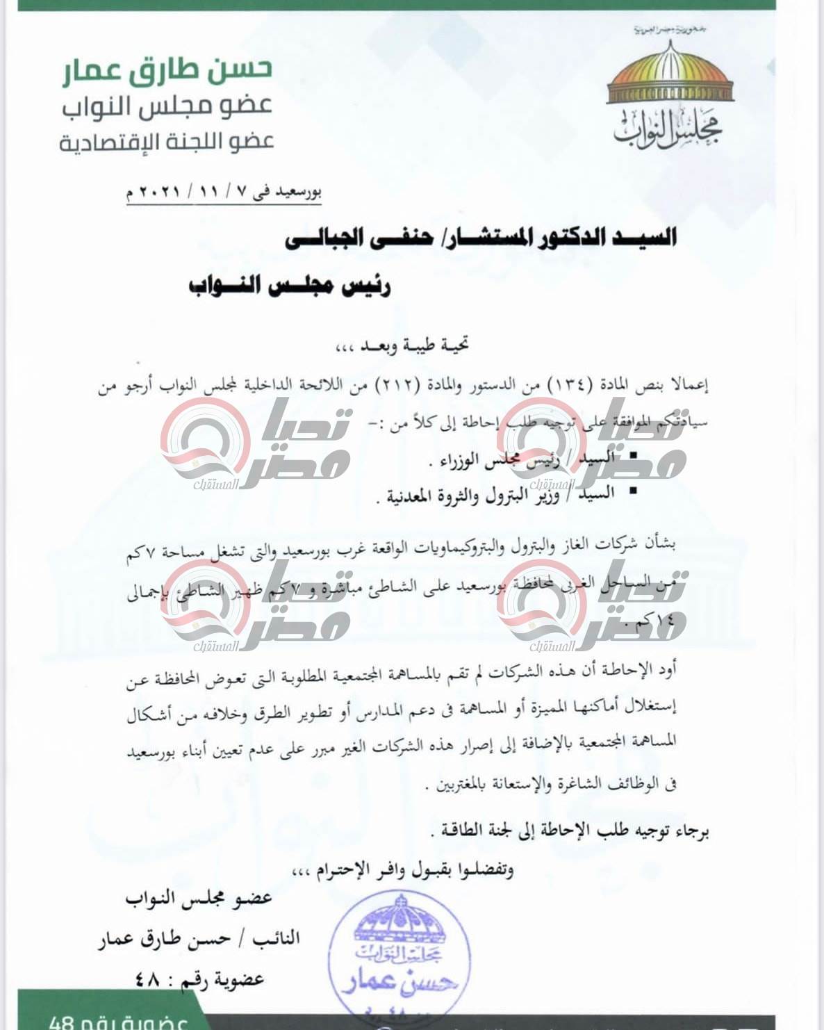 ناقشت لجنة الطاقة والبيئة بمجلس النواب، طلب الإحاطة المقدم من البرلماني حسن طارق عمار عضو مجلس النواب عن محافظة بورسعيد، والذي تقدم به ضد شركات البترول و الغاز و البتروكيماويات العاملة بغرب بورسعيد، بحضوراللواء عادل الغضبان بصفته محافظًا لبورسعيد، والمهندس حسام التونى نائب رئيس الهيئة العامة للبترول، والمهندس خالد موافى رئيس مجلس ادارة شركة بتروبل، وذلك إستجابة لمطالب النائب في طلب الإحاطة.