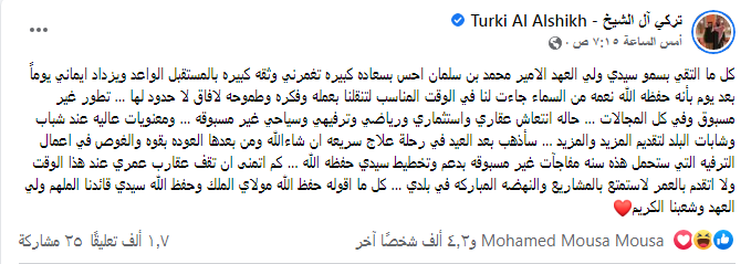 وقال "تركي آل الشيخ": "سأذهب بعد العيد في رحلة علاج سريعة إن شاءالله ومن بعدها العوده بقوه والغوص في أعمال الترفيه التي ستحمل هذه سنه مفاجآت غير مسبوقه بدعم وتخطيط سيدي حفظه الله.. كم أتمنى أن تقف عقارب عمري عند هذا الوقت ولا أتقدم بالعمر لاستمتع بالمشاريع والنهضة المباركة في بلدي.. كل ما أقوله حفظ الله مولاي الملك وحفظ الله سيدي قائدنا الملهم ولي العهد وشعبنا الكريم".