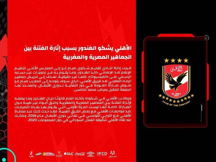 وأكد رئيس الأهلي على ثقته الكاملة في هذه الجهات الوطنية لإيقاف ما يحدث، والذي يتعارض مع العلاقات الطيبة التي تربط بين الجماهير المصرية وشقيقتها العربية خاصة المغربية.