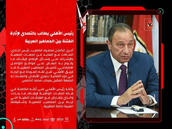 أجرى الكابتن محمود الخطيب، رئيس النادي، اتصالات مع العديد من الجهات المعنية بالإشراف على وسائل الإعلام، لإيقاف ما يقوم به البعض على مواقع التواصل الاجتماعي، لتحريض الجماهير المغربية ضد فريق الأهلي، قبل لقاء العودة مع الرجاء في دور الثمانية لدوري الأبطال، والمحدد له الجمعة المقبل بمركب محمد الخامس.