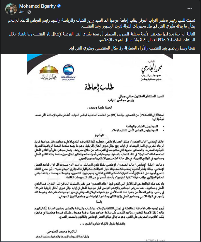 تقدم أحد أعضاء مجلس إدارة النادي الأهلي،بصفته النيابية بطلب إحاطة موجها إلى وزير الشباب والرياضة ورئيس المجلس الأعلى للإعلام بشأن ما يفعله مثيري الفتن في ظل مجهودات الدولة لعودة الجمهور ونبذ التعصب من تحريض خالد الغندور لجمهور الرجاء المغربي على النادي الأهلي.