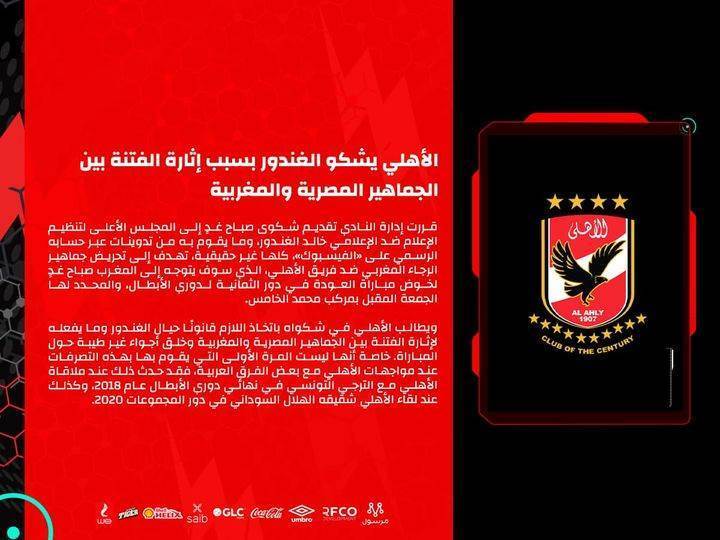 وكان النادي الأهلي، قد أصدر، بيانًا، مساء أمس، طالب فيه باتخاذ اللازم قانونًا حيال خالد الغندور وما يفعله لإثارة الفتنة بين الجماهير المصرية والمغربية وخلق أجواء غير طيبة حول المباراة. خاصة أنها ليست المرة الأولى التي يقوم بها بهذه التصرفات عند مواجهات الأهلي مع بعض الفرق العربية.