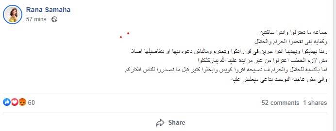 كتبت الفنانة رنا سماحة في منشور عبر صفحتها الرسمية بموقع التواصل الاجتماعي فيسبوك: “جماعة ما تعتزلوا وأنتوا ساكتين، وكفاية بقى تقحموا الحرام والحلال”.