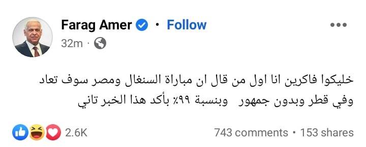 ونشر فرج عامر رئيس نادي سموحة السابق عبر حسابة الرسمي"فيس بوك:"خليكوا فاكرين أنا أول من قال أن مباراة السنغال ومصر سوف تعاد وفي قطر وبدون جمهور وبنسبة 99بأكد خهذا الخبر تاني”.