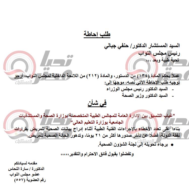 سارة النحاس تتقدم بطلب إحاطة لغياب التنسيق بين المجالس الطبية بوزارة الصحة والمستشفيات الجامعية بالتعليم العالي