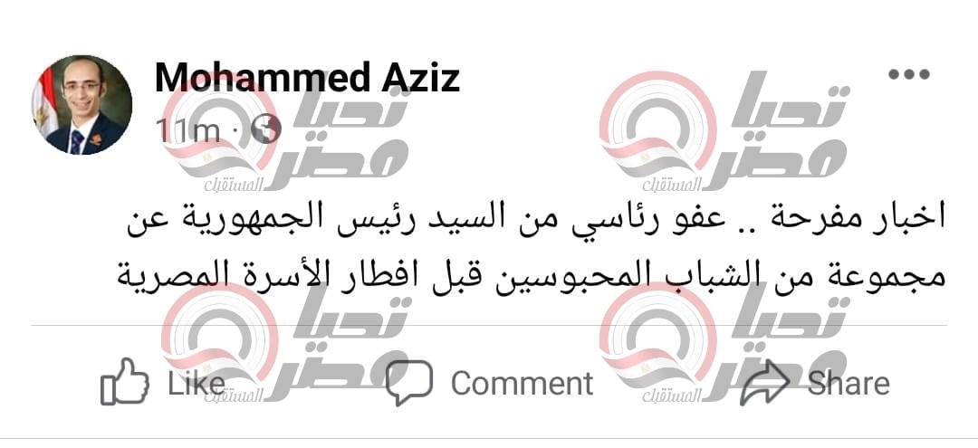 كشف النائب محمد عبد العزيز وكيل لجنة حقوق الإنسان بمجلس النواب عضو تنسيقية شباب الأحزاب والسياسين عن عفو رئاسي من الرئيس عبد الفتاح السيسى رئيس الجمهورية عن مجموعة من الشباب المحبوسين قبل افطار الأسرة المصرية.