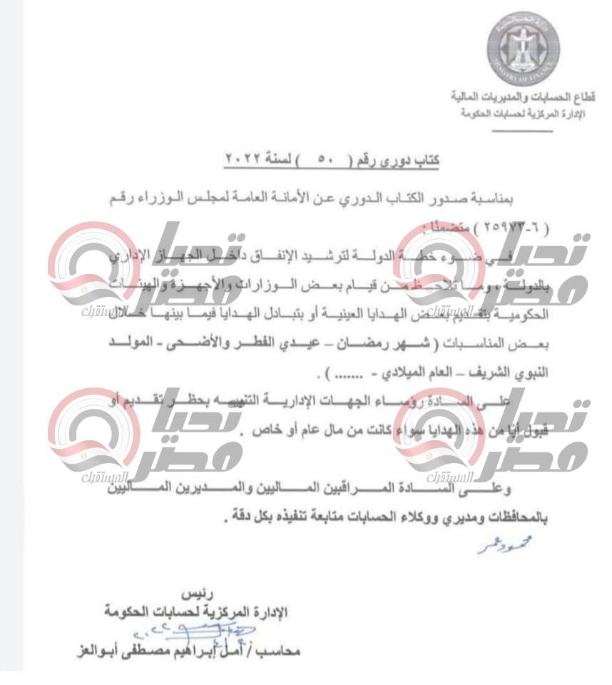 وجاء في بيان المركزية:” فـي ضـوء خطـة الدولـة لترشيد الإنفـاق داخـل الجهـاز الإداري بالدولـة ، ومـا تلاحـظ مـن قـيـام بـعـض الـوزارات والأجهـزة والهينـات الحكوميـة بتقـديم بعـض الهـدايا العينيـة أو بتبادل الهـدايا فيمـا بينهـا خـلال بعـض المناسبات ( شـهر رمضـان - عبـدي الفطـر والأضـحى - المولـد النبوي الشريف - العام الميلادي - ).