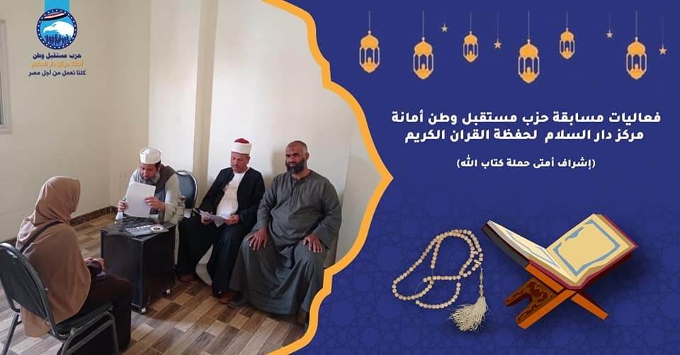 تواصل أمانة مركز دار السلام، فعاليات المسابقة الدينية، لحفظة القرآن الكريم، حيث جريت فعاليات المسابقة بمقر أمانة المركز، تحت عنوان "إشراف أمتي حملة كتاب الله"، وشهدت المسابقة إقبال كبير من المتسابقين من مختلف الفئات العمرية.