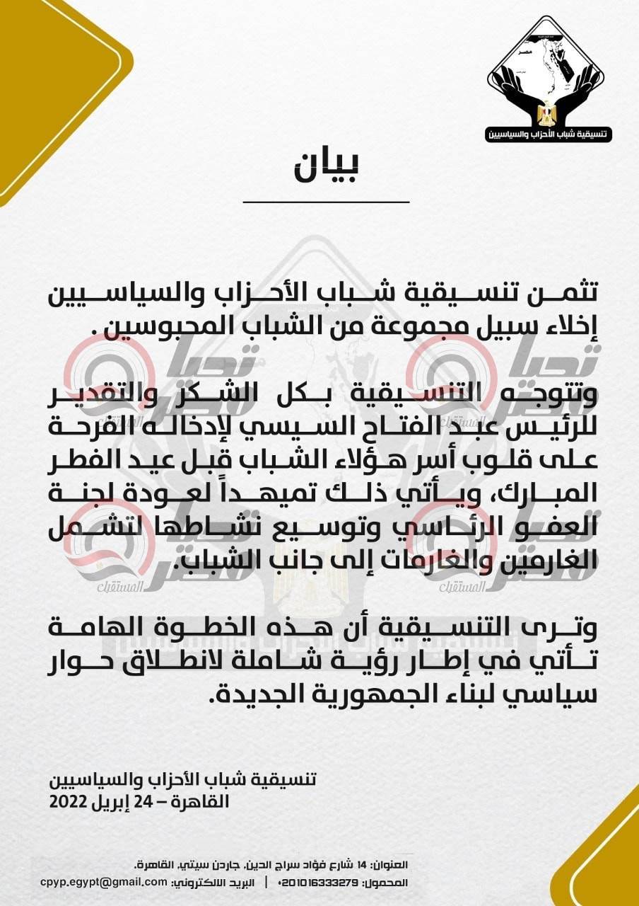 ثمنت تنسيقية شباب الأحزاب والسياسيين إخلاء سبيل مجموعة من الشباب المحبوسين، حيث توجهت بكل الشكر والتقدير للرئيس عبد الفتاح السيسي لإدخاله الفرحة على قلوب أسر هؤلاء الشباب قبل عيد الفطر المبارك.