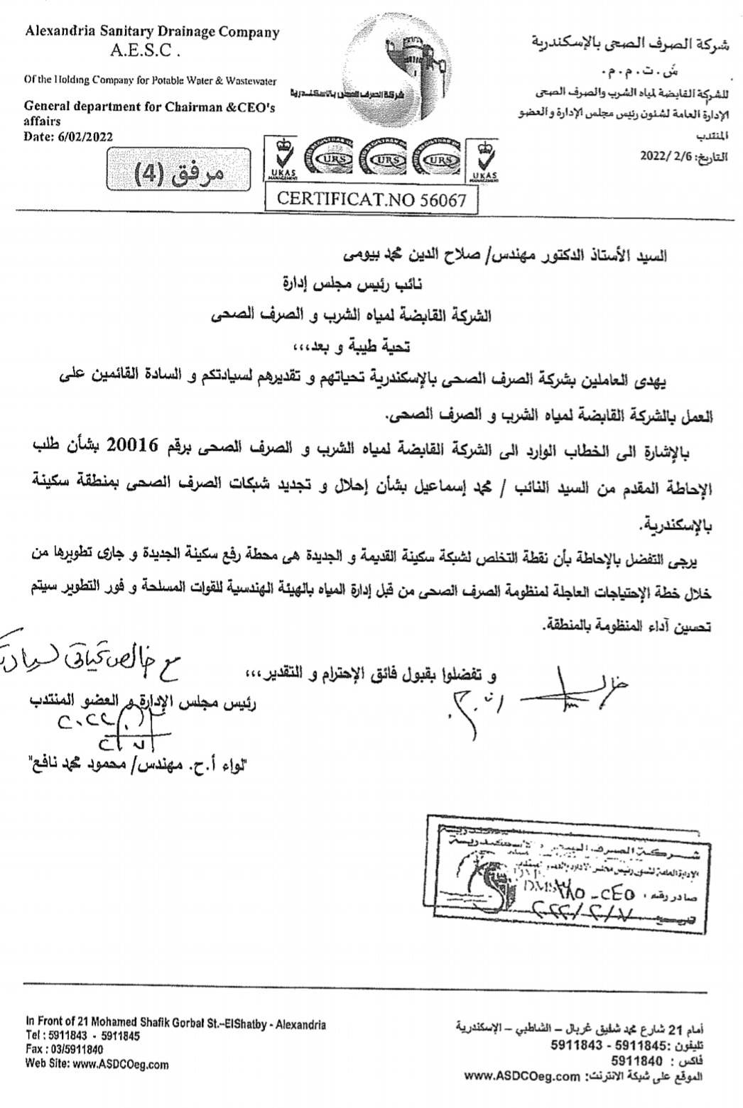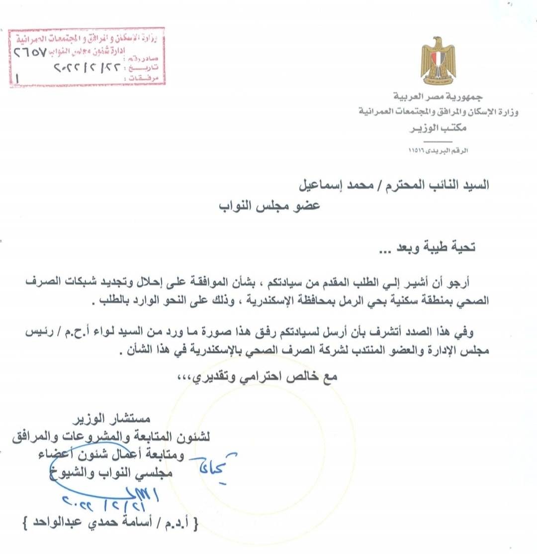 وقال إسماعيل، أنه نتيجة لطلب الإحاطة الذي تقدم به لوزير الإسكان والمرافق الدكتور عاصم الجزار، فإنه أوضحت شركة الصرف الصحى بالإسكندرية بأن نقطة التخلص لشبكة سكينة القديمة و الجديدة هي محطة رفع سكينة الجديدة، و أنه جارى تطويرها من خلال خطة الإحتياجات العاجلة لمنظومة الصرف الصحى من قبل إدارة المياه بالهيئة الهندسية للقوات المسلحة و فور التطوير سيتم تحسين أداء المنظومة بالمنطقة.