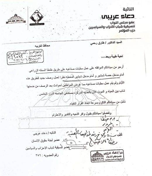 محافظ الغربية يستجيب لنائبة التنسيقية بعمل مطب بمدخل شبشير