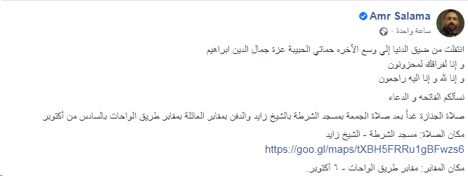 كتب المخرج عمرو سلامة عبر صفحته الرسمية بموقع التواصل الاجتماعي فيسبوك: “انتقلت من ضيق الدنيا إلى وسع الآخرة حماتي الحبيبة عزة جمال الدين إبراهيم.. وإنا لفراقك لمحزونون وإنا لله وإنا إليه راجعون، نسألكم الفاتحه والدعاء”.