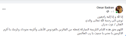 أعلن عمر بدران نجل الفنان عزت بدران وفاة والده عبر صفحته الشخصية بموقع التواصل الاجتماعي “فيسبوك”، قائلًا: “إنا لله وإنا إليه راجعون توفي إلى رحمة الله تعالى والدي الفنان عزت بدران”.