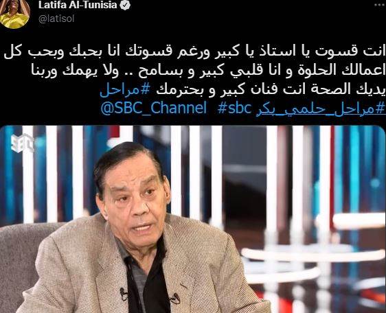 كتبت الفنانة لطيفة تغريدة عبر صفحتها الرسمية بموقع التدوينات القصيرة تويتر، ووجهت من خلالها رسالة للموسيقار حلمي بكر قالت بها: “أنت قسوت يا أستاذ يا كبير ورغم قسوتك أنا بحبك”.