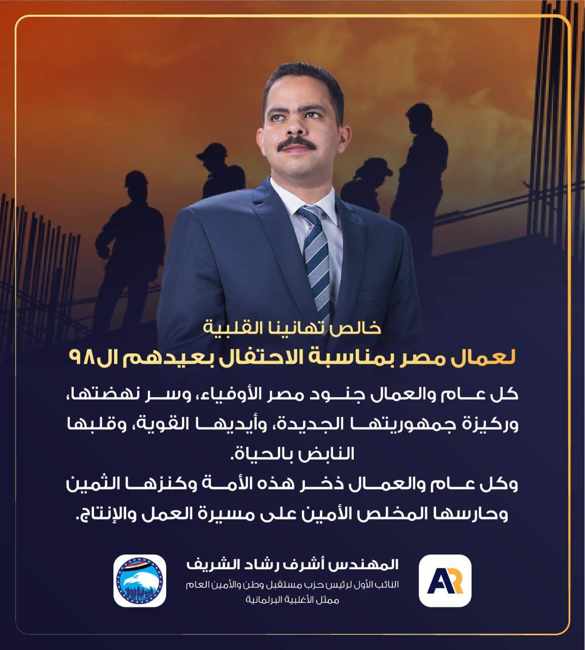 ممثل الأغلبية أشرف رشاد الشريف قال :"خالص تهانينا القلبية لعمال مصر بمناسبة الاحتفال بعيدهم كل عام والعمال ذخر هذه الأمة وكنزها الثمين وحارسها المخلص الأمين على مسيرة العمل والإنتاج".فيما تقدمت تنسيقية شباب الأحزاب والسياسيين بالتهنئة لسواعد مصر المخلصة بمناسبة عيد العمال، وأعربت التنسيقية عن شكرها لعمال مصر الذين كانوا ومازالوا حجر الأساس في قاطرة التنمية فخالص التحية والتقدير لكل من يرفع راية الإتقان في عمله.