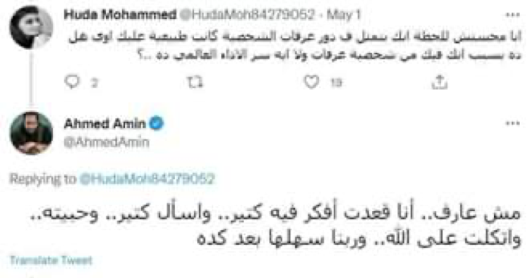 كما أجاب عن سؤال أخر حول إطلاعه على المراجع الصوفية قبل تقديم هذا الدور وقال: قريت قبل وبعد الدور.. واتفرجت على دروس ومتحدثين.. بس اللي نفعني أكتر لقاءات مع ناس فاهمين وسألتهم كتير.