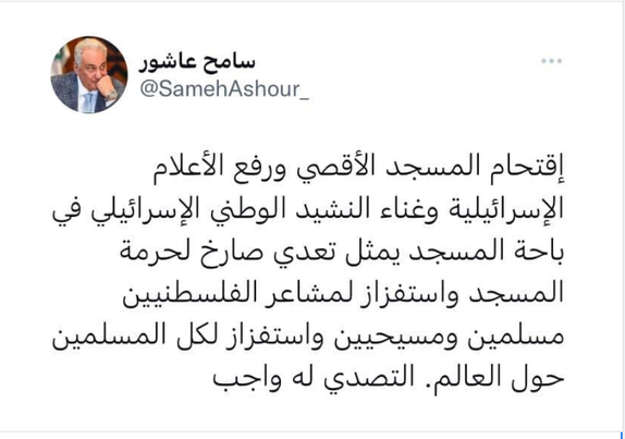 وكتب "عاشور"، صفحته على ىتويتر: “إن اقتحام المسجد الأقصي ورفع الأعلام الإسرائيلية وغناء النشيد الوطني الإسرائيلي في باحة المسجد يمثل تعدي صارخ لحرمة المسجد واستفزاز لمشاعر الفلسطنيين مسلمين ومسيحيين واستفزاز لكل المسلمين حول العالم".