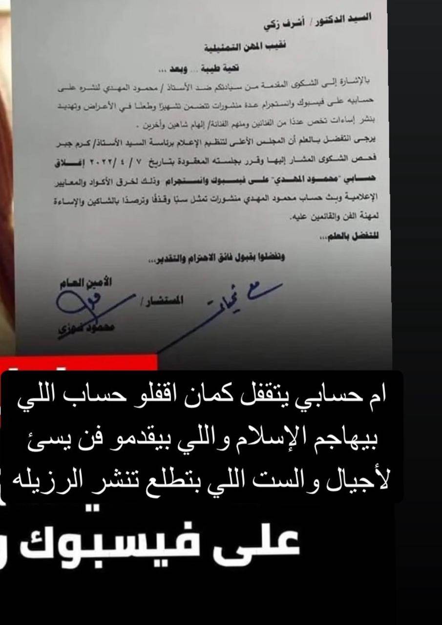 ويشار أن المجلس الأعلى لتنظيم الإعلام كان قد أصدر بيان بإغلاق الحسابات الرسمية للفنان الشاب محمود المهدي، وذلك بسبب خرقه الأكواد والمعايير الإعلامية وبثه منشورات تمثل سبا وقذفا والإساءة لمهنة الفن والقائمين عليها.
