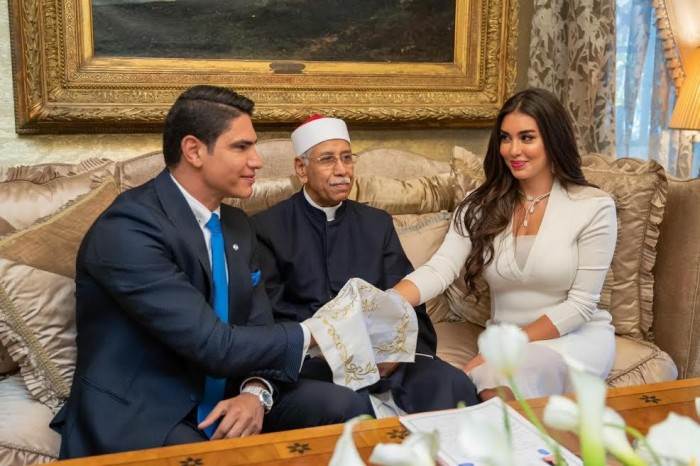 كما كانت مراسم عقد القران فى منزل الأسرة دون حضور كبير للمدعوين من مجتمعى الفن والأعمال، وذلك التزاما بالإرشادات الرسمية بشأن أزمة فيروس كورونا.