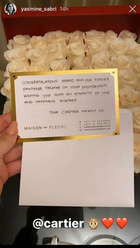 وظهرت فيها هدية باهظة الثمن من ماركة كارتييه العالمية، المتخصصة في تصنيع المجوهرات وساعات اليد، تلقتها بعد إعلان خطبتها على رجل الأعمال أحمد أبو هشيمة، وكانت هذه الهدية حديث السوشيال ميديا حينها.