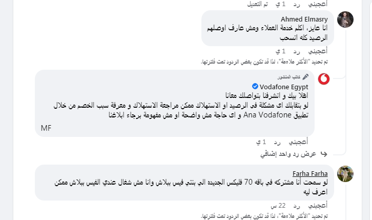 وجدير بالذكر أن في كل مرة يكون رد شركة فودافون Vodafoneعلى عملائها :"بنعتذرلك عن أى حاجة مضايقاك ومش دى التجربة اللى بنتمنهالك معانا.. ونسعى لحل المشكلة".