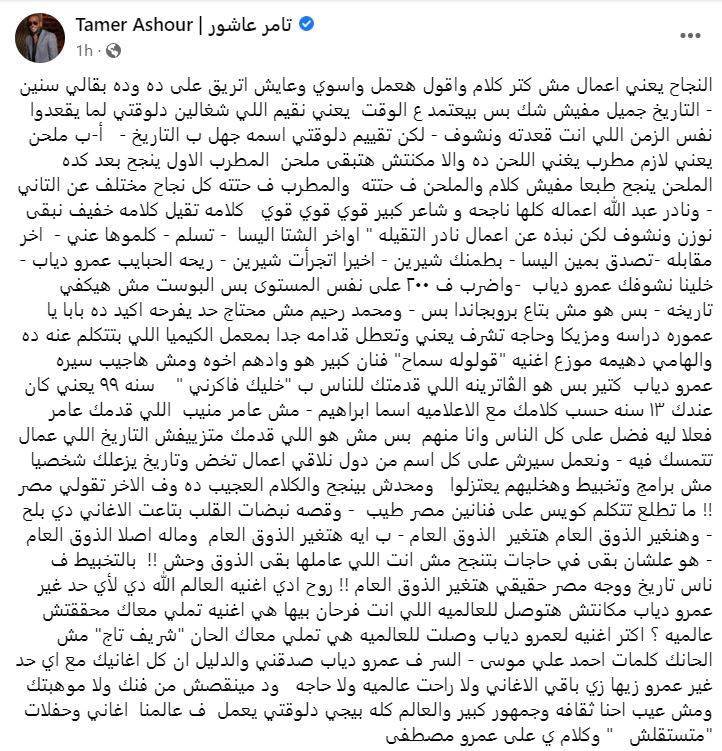 كتب الفنان تامر عاشور عبر صفحته الرسمية بموقع التواصل الاجتماعي “فيسبوك”: “النجاح يعني أعمال.. مش كتر كلام وأقول هعمل وأسوي وعايش اتريق على ده وده بقالي سنين.. التاريخ جميل مفيش شك بس بيعتمد ع الوقت يعني نقيم اللي شغالين دلوقتي لما يقعدوا نفس الزمن اللي انت قعدته ونشوف”.