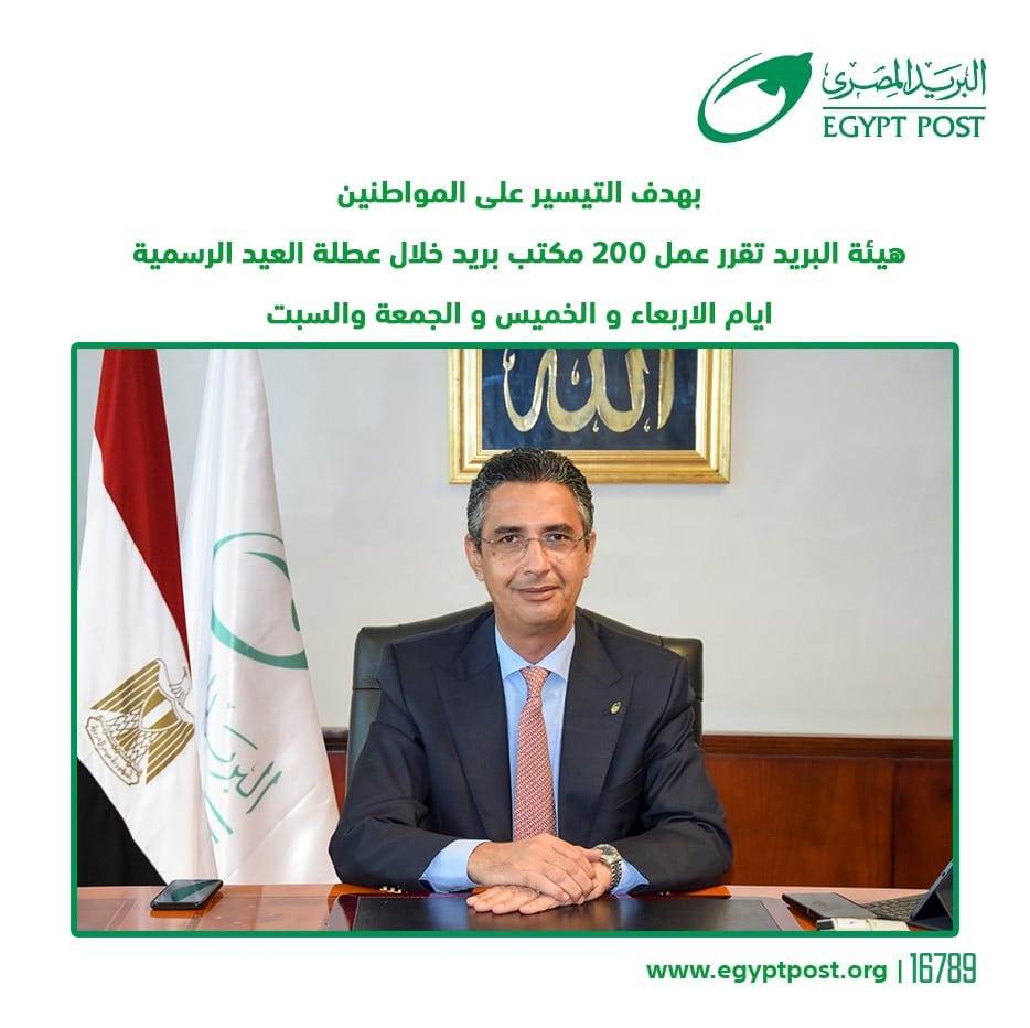 وتم منح إجازة لمكاتب البريد المصري خلال إجازة عيد الفطر المبارك من يوم 29 أبريل حتى يوم الثلاثاء 3 مايو، وتم تشغيل بعض مكاتب البريد أول أمس الأربعاء الموافق 4 مايو ويوم الخميس الموافق 5 مايو من الساعة 8 صباحاً حتى الساعة 3 مساءاً، وذلك حرصا من الهيئة على تقديم كافة الخدمات للعملاء والمواطنين.