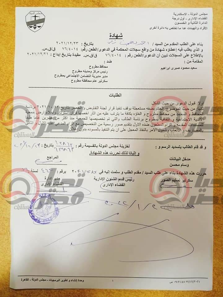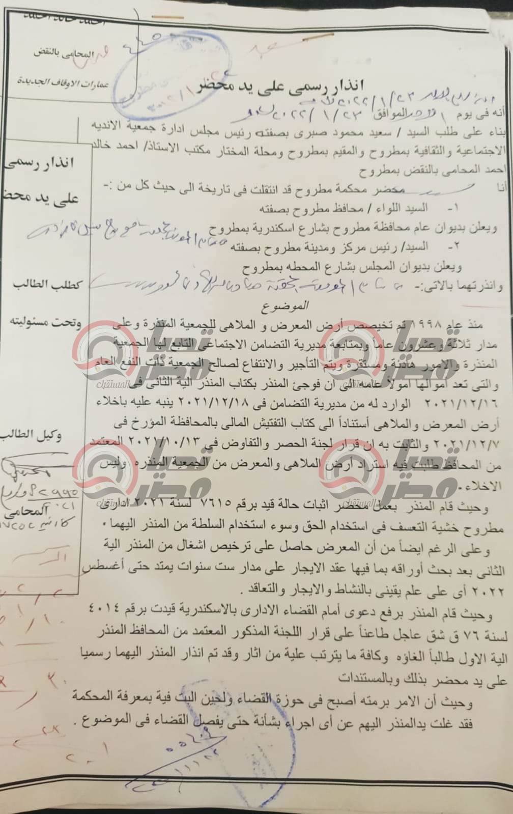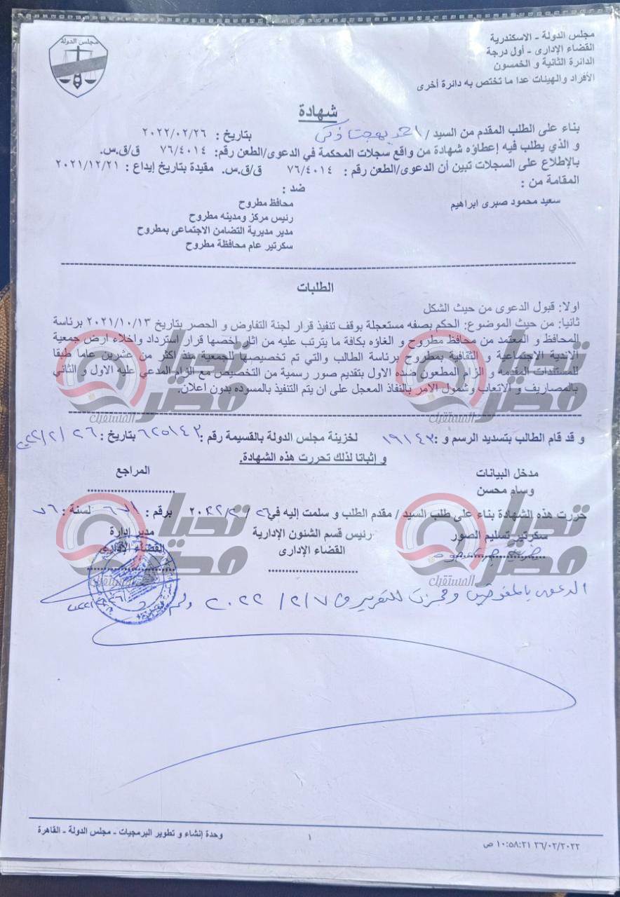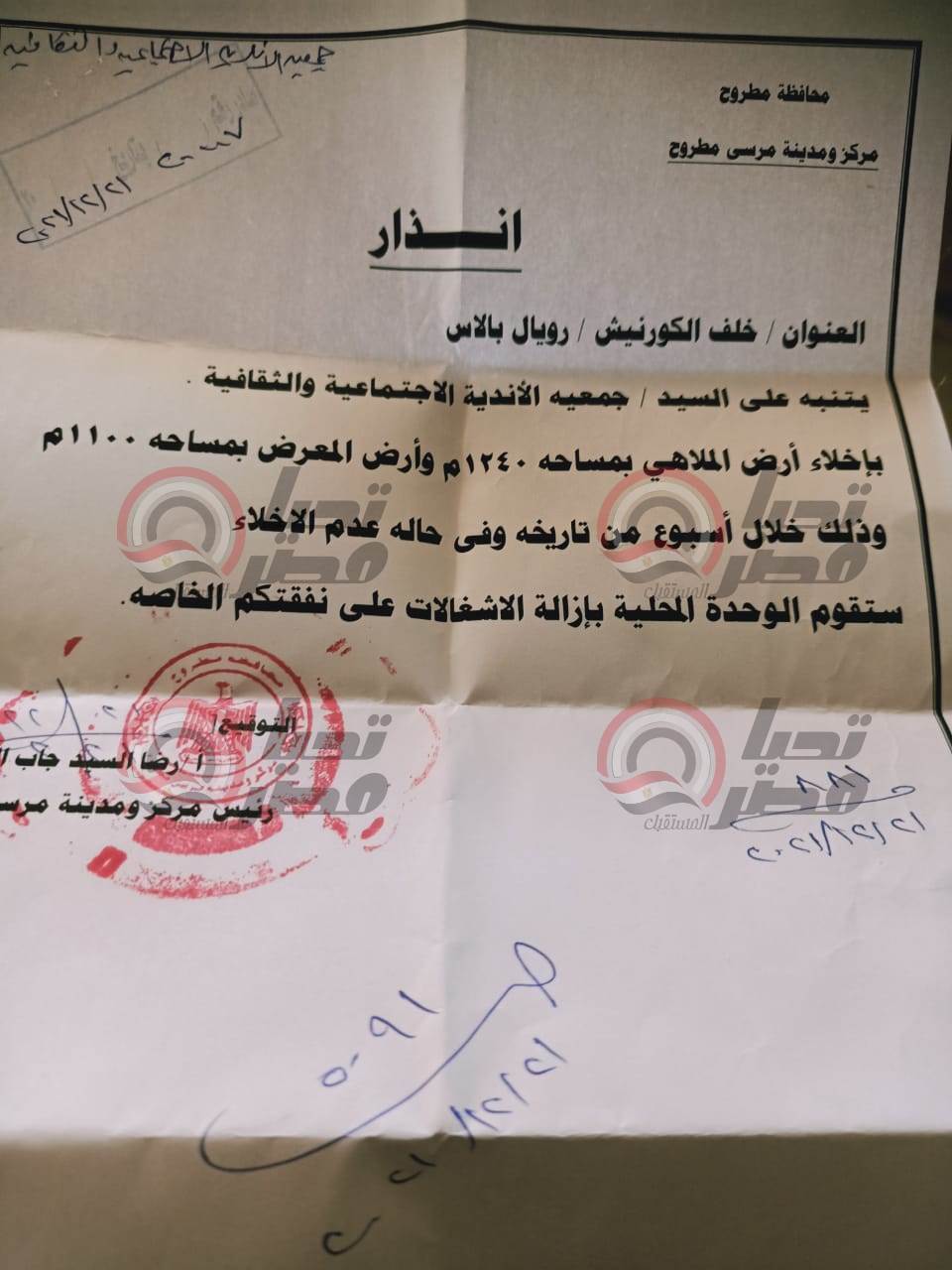بمرور الوقت ولحين تحديد موعد أخر لاجتماع لجنة الإدارة المحلية بمجلس النواب، رفع أبناء محافظة مطروح دعوى أمام القضاء أيضا حرصا منهم على الحفاظ على حقوق أبناء المحافظة وعدم إهدارها خاصة أن النادى الاجتماعى من الأماكن الحيوية للمحافظة، إلا أن الأهالى تفاجئوا مساء الجمعة وعقب انتهاء أجازة عيد الفطر المبارك، بإرسال محافظ مطروح خطاب لمديرية أمن مطروح بتنفيذ الإزالة على أرض النادى الاجتماعى غدا السبت صباحا وعلى مسئوليته الشخصية.