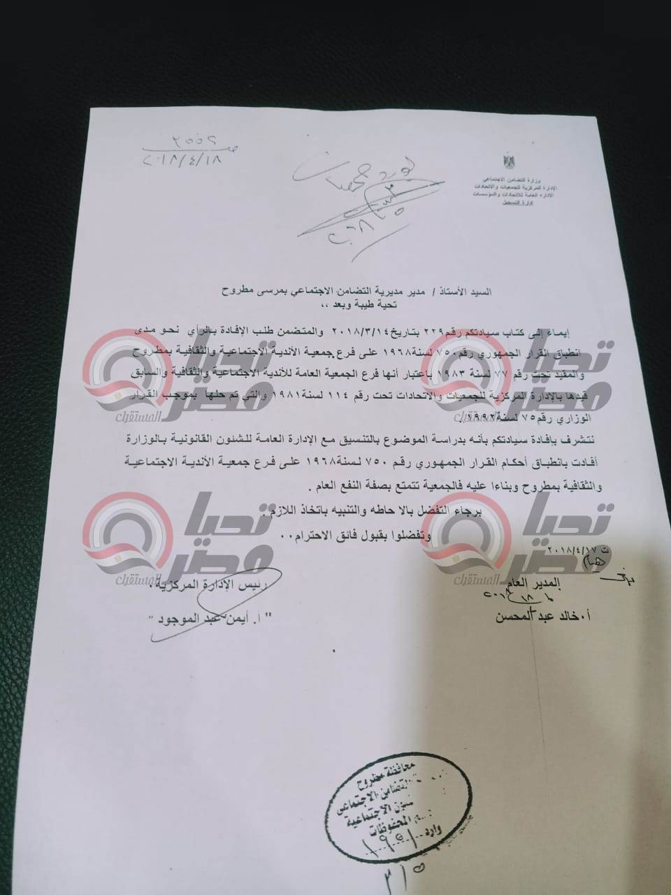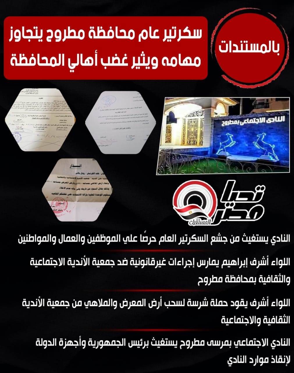 أهالى وأبناء محافظة مطروح أعلنوا عن استغاثاتهم من هذه التصرفات ويوجوها رسالة للرئيس عبد الفتاح السيسى ورئيس مجلس الوزراء د. مصطفى مدبولى، واللواء محمود توفيق، وزير الداخلية، واللواء محمود شعراوى وزير التنمية المحلية ونواب محافظة مطروح،لتدخلهم فى هذا الأمر وتحقيق الصالح العام لأهالى وأبناء محافظة مطروح ودعم النادى الإجتماعى الذى يعد أحد الأماكن الحيوية والمحببة لأهالى وأبناء المحافظة.