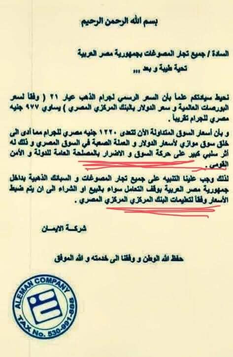 وقال وائل شهبون المستشار الاعلامي للاتحاد العام للغرف التجارية، إن الورقة التي ظهرت لا تمت للواقع بصلة ولا سوق الذهب و الصرافة، مؤكدا أنه لا يوجد أي قرار حكومي أو وزاري بالقيود على سوق الذهب، مضيفا « كله ده كلام فاضي ده واحد عايز يطلع حاجة تخصه ومايعرفش حاجة عن السوق».