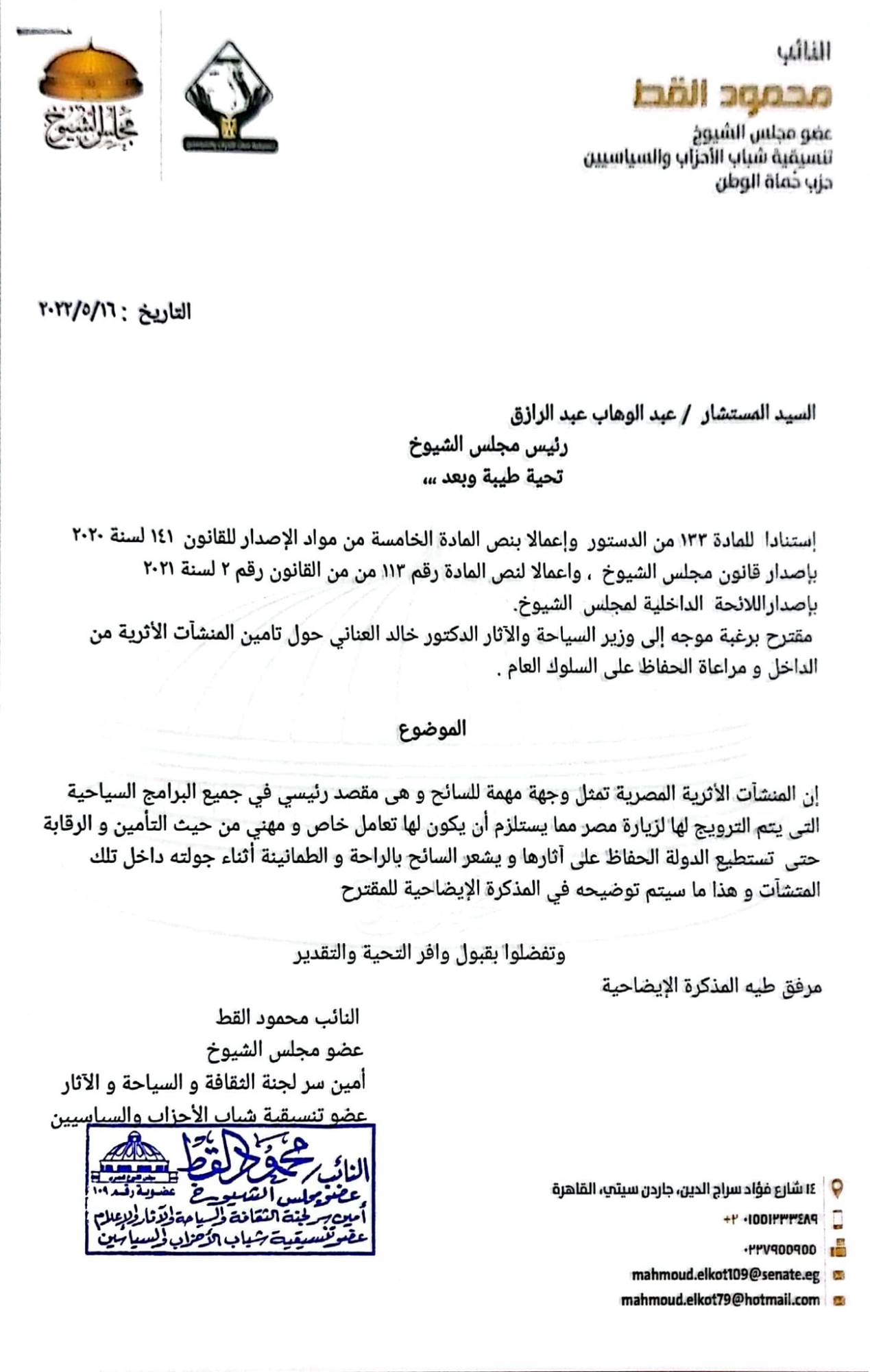 تقدم النائب محمود القط، أمين سر لجنة الثقافة والسياحة والآثار والإعلام بمجلس الشيوخ عن تنسيقية شباب الأحزاب والسياسيين، باقتراح برغبة للمستشار عبدالوهاب عبدالرازق رئيس مجلس الشيوخ، موجه إلي وزير السياحة والآثار الدكتور خالد العناني، حول تأمين المنشآت الأثرية من الداخل ومراعاة الحفاظ علي السلوك العامة.